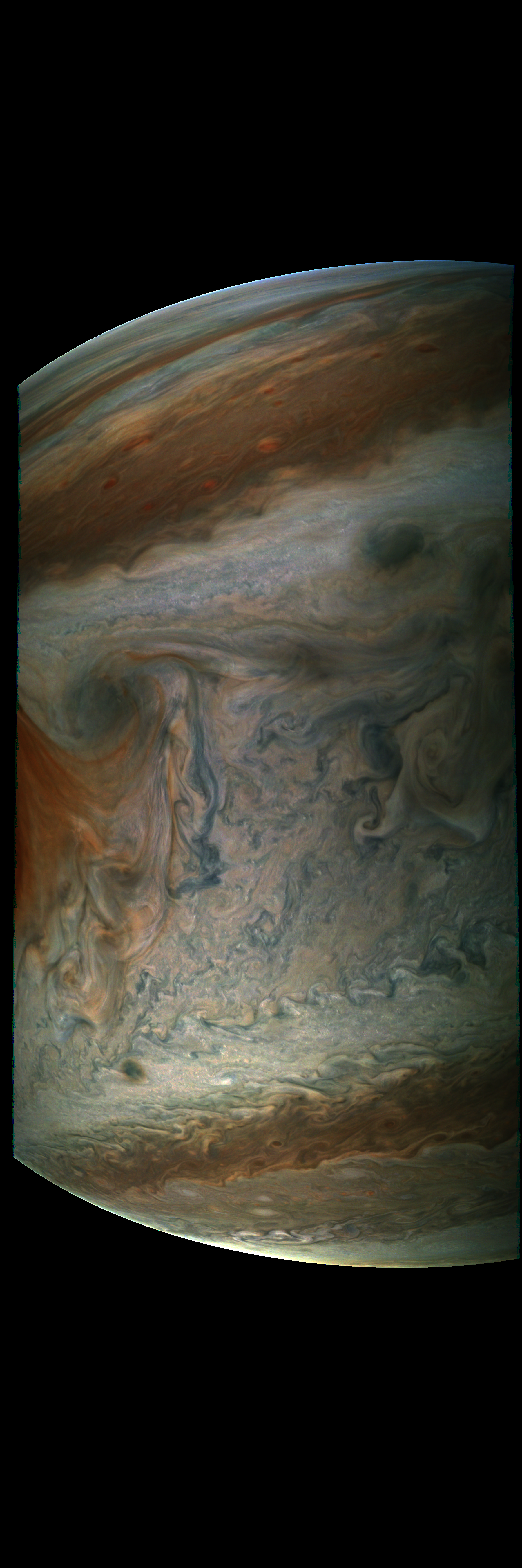 The raw has been decompanded, approximately radiometrically corrected, reprojected to a cylindrical FOV of 60x180 degrees using SPICE kernels and a Jupiter spheroid model, illumination-adjusted by a slightly modified best-fit illumination model derived from PJ6 images, gamma-stretched with gamma=4 relative to radiometric data, and mostly patched from repetitive camera artifacts.