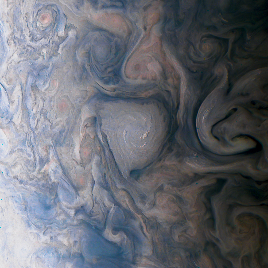 Junocam pixels are 12 bits deep from the camera but are converted to 8 bits inside the instrument using a lossless "companding" table, a process similar to gamma correction, to reduce their size. All Junocam products on the missionjuno website are in this 8-bit form as received on Earth. Scientific users interested in radiometric analysis should use the "RDR" data products archived with the Planetary Data System, which have been converted back to a linear 12-bit scale.