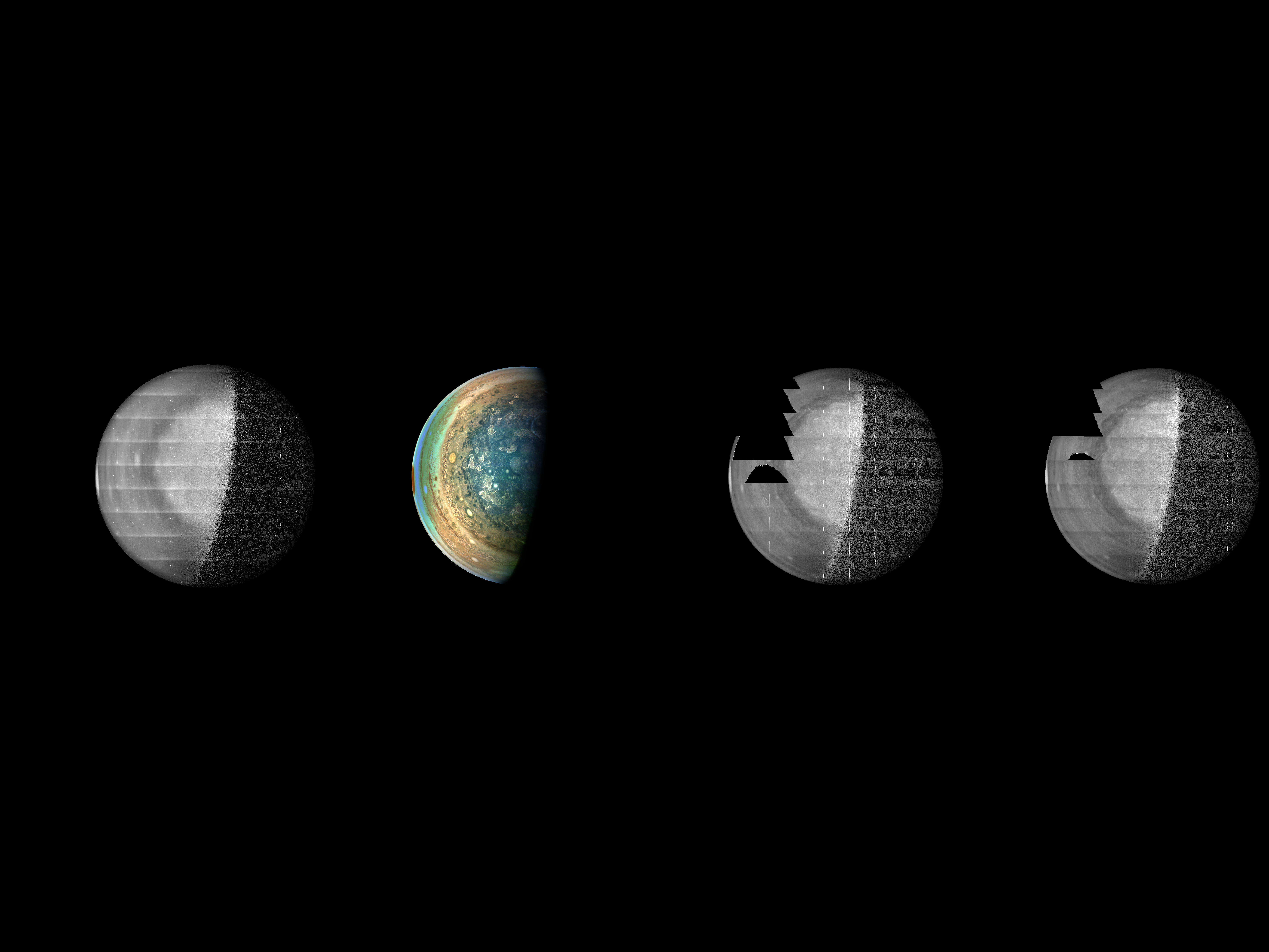 A special note about the Earth Flyby mission phase images: these were acquired in 2013 when Juno flew past Earth. Examples of processed images are shown; most contributions are from amateurs.
