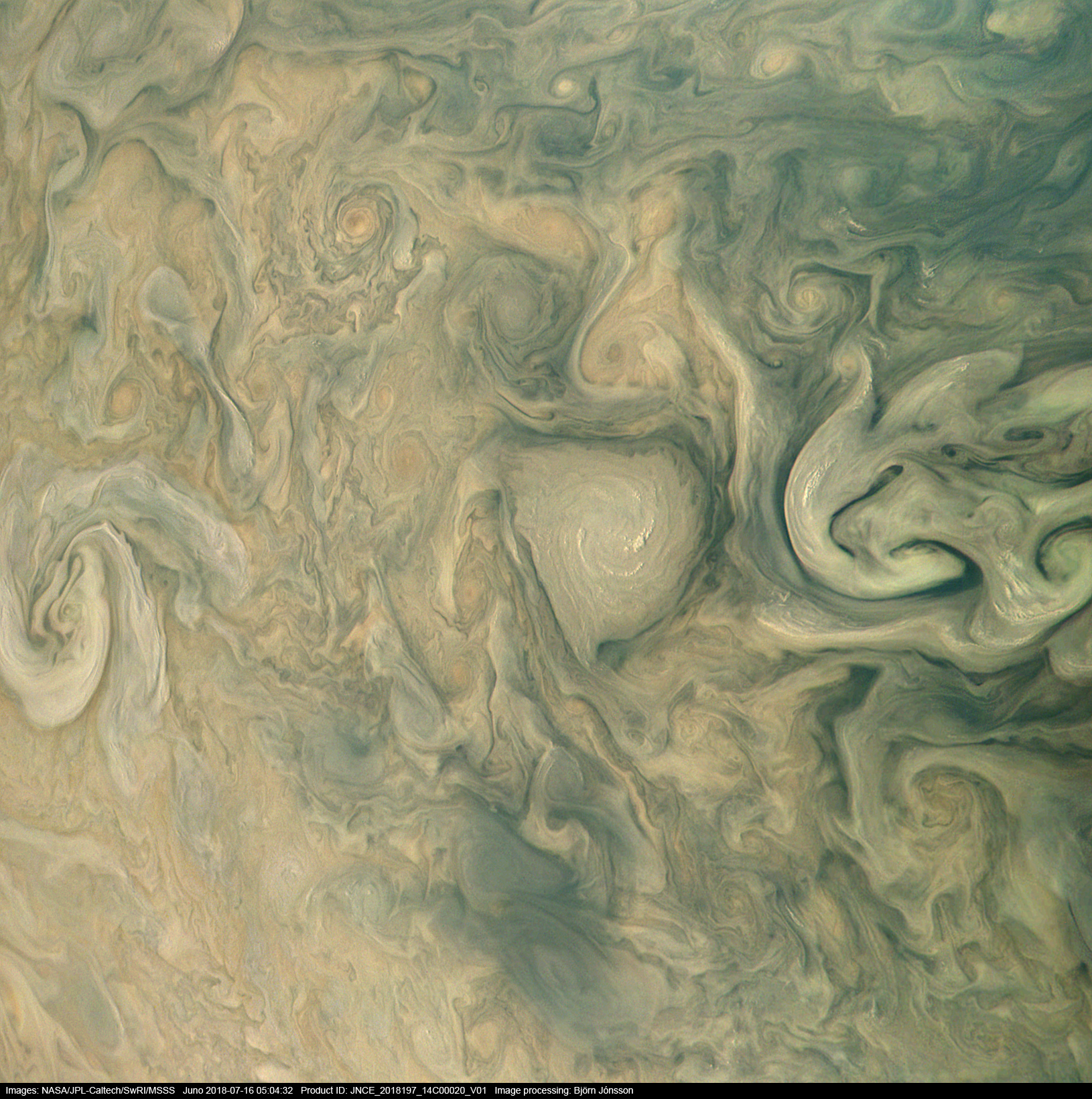 This image has been processed from the raw PJ14_20 framelets by removing the effects of global illumination. The contrast/color was then increased and small scale features sharpened.