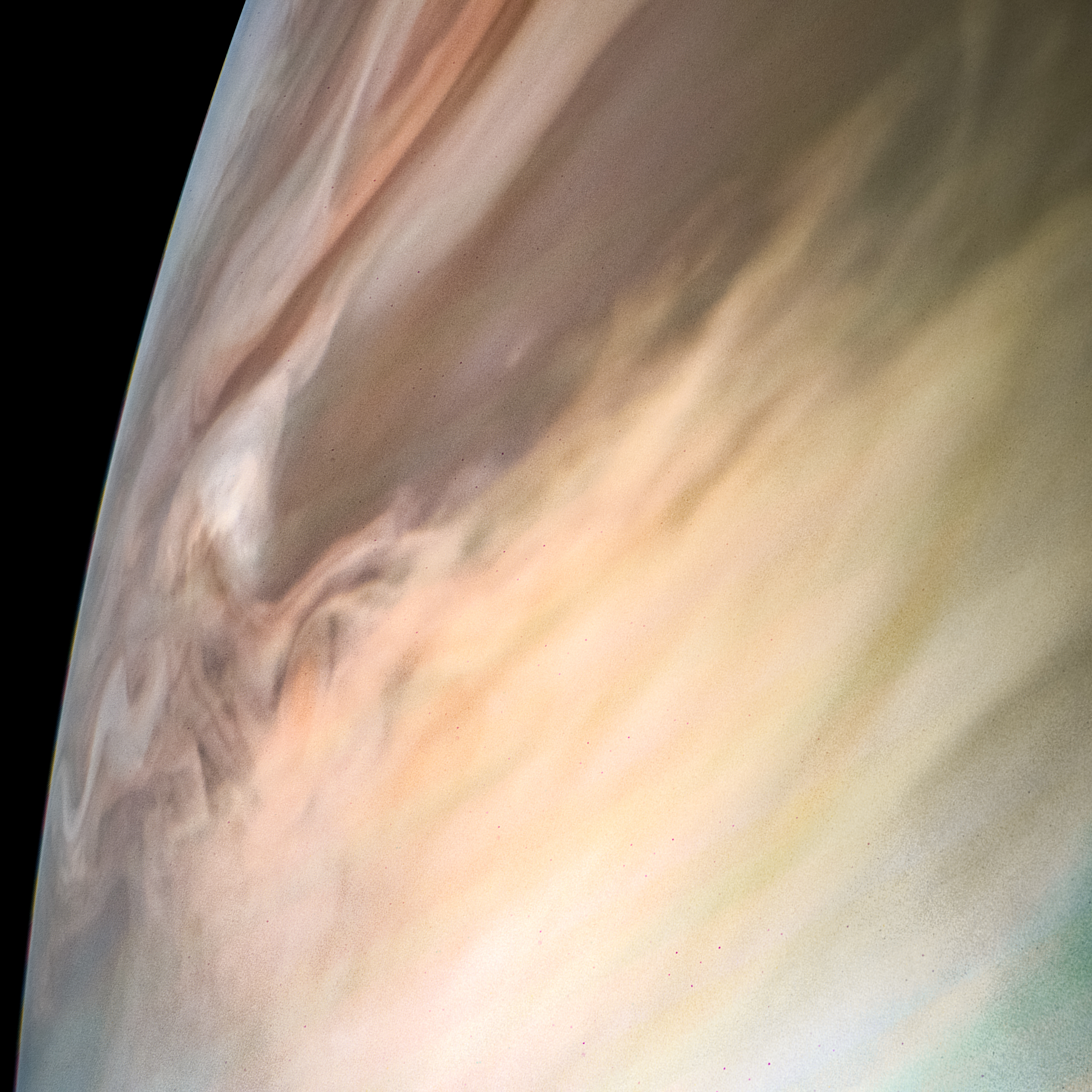 Junocam pixels are 12 bits deep from the camera but are converted to 8 bits inside the instrument using a lossless "companding" table, a process similar to gamma correction, to reduce their size. All Junocam products on the missionjuno website are in this 8-bit form as received on Earth. Scientific users interested in radiometric analysis should use the "RDR" data products archived with the Planetary Data System, which have been converted back to a linear 12-bit scale.