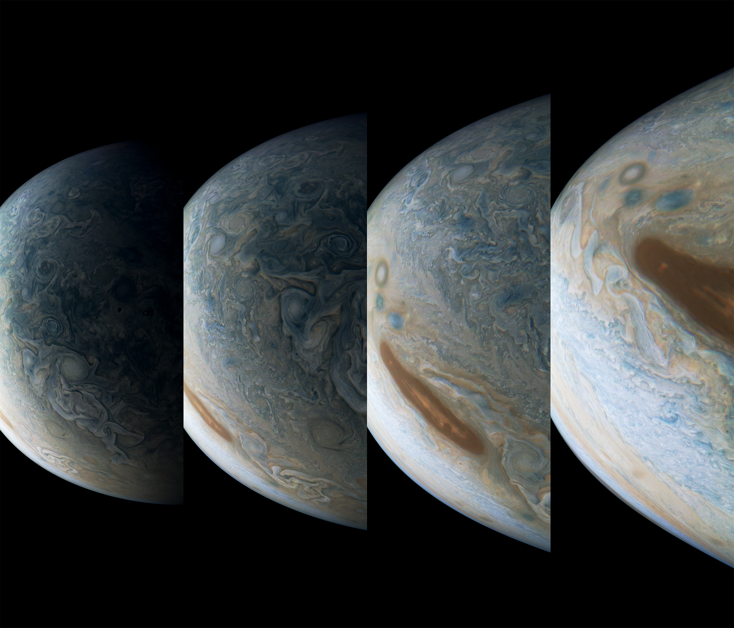 A special note about the Earth Flyby mission phase images: these were acquired in 2013 when Juno flew past Earth. Examples of processed images are shown; most contributions are from amateurs.