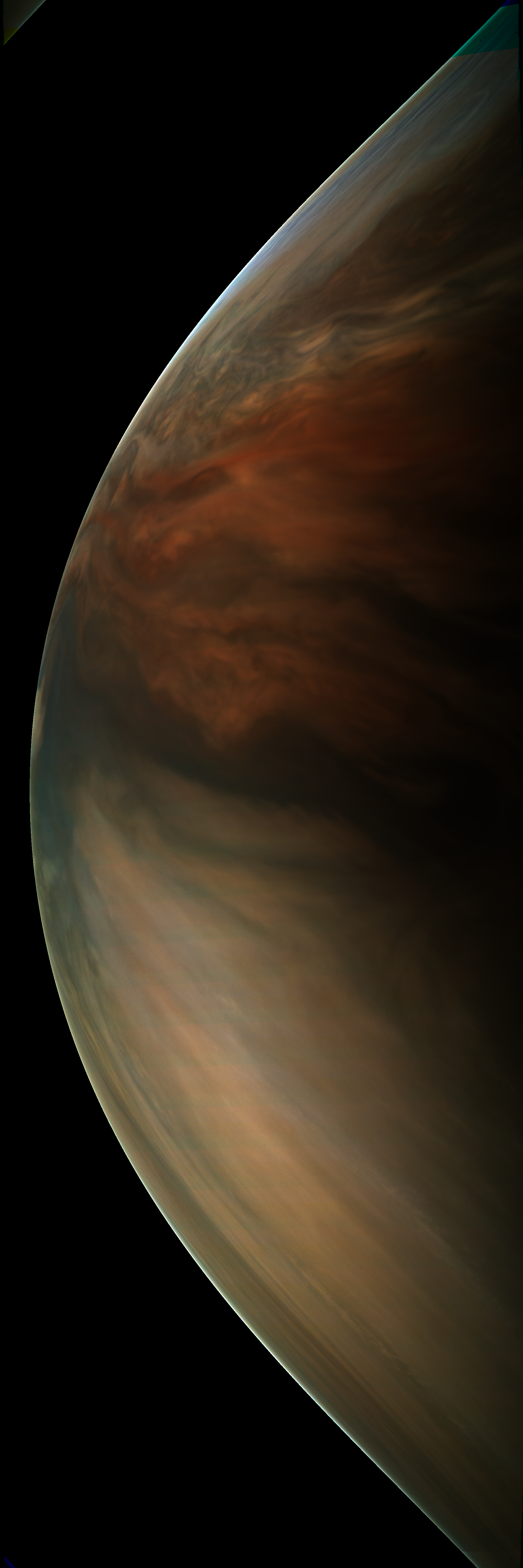 Resolution is 30 pixels per degrees in an equdistant cylindrical system centered to the camera at image stop time, with an axis parallel to Juno's spin axis. The rendered field of view is 60x180 degrees.