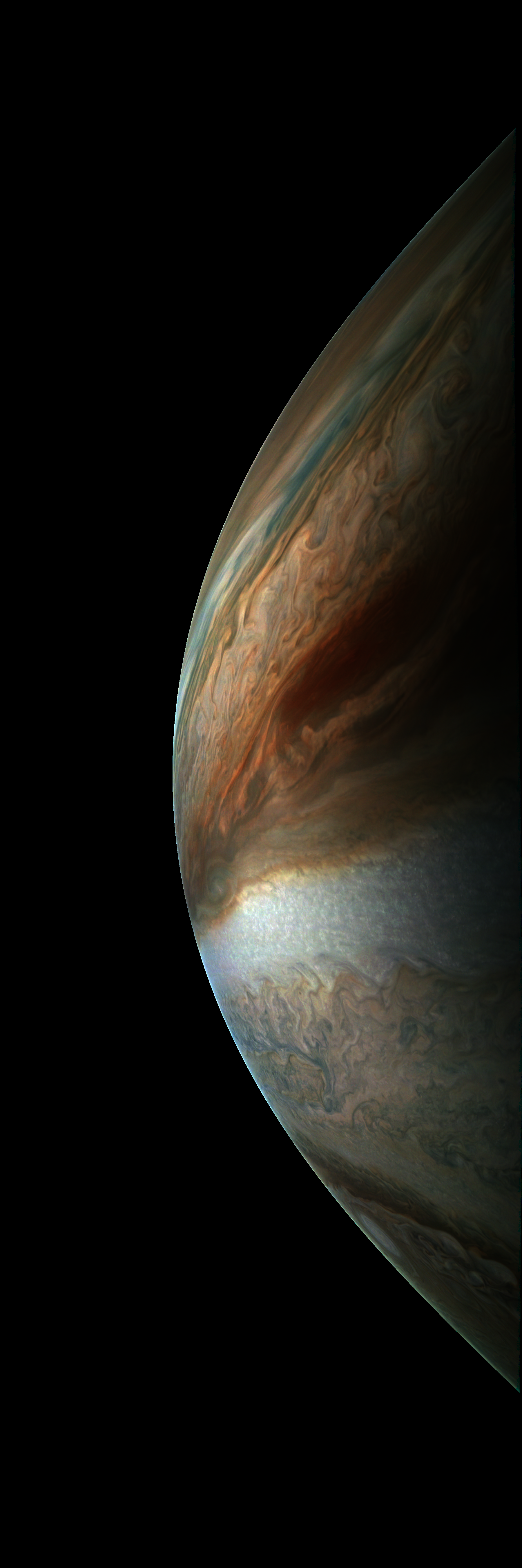 Resolution is 30 pixels per degrees in an equdistant cylindrical system centered to the camera at image stop time, with an axis parallel to Juno's spin axis. The rendered field of view is 60x180 degrees.