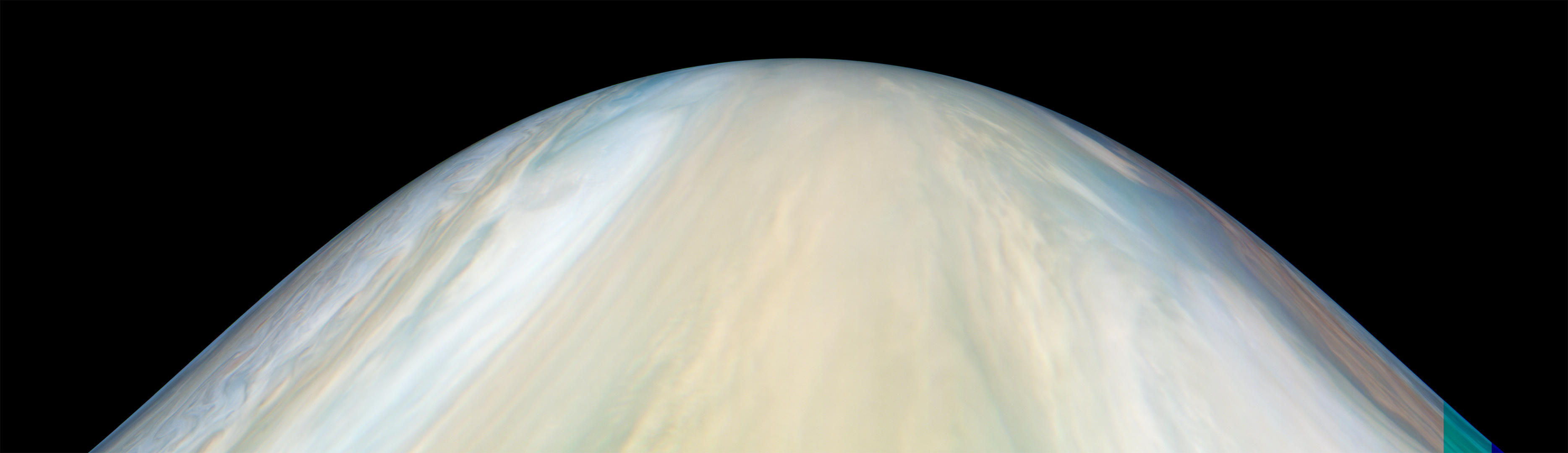 We have a methane filter, included for the polar science investigation, that is almost at the limits of our detector’s wavelength range. To get enough photons for an image we need to use a very long exposure. In some images this results in scattered light in the image. For science purposes we will simply crop out the portions of the image that include this artifact. Work is in progress to determine exactly what conditions cause stray light problems so that this can be minimized for future imaging.