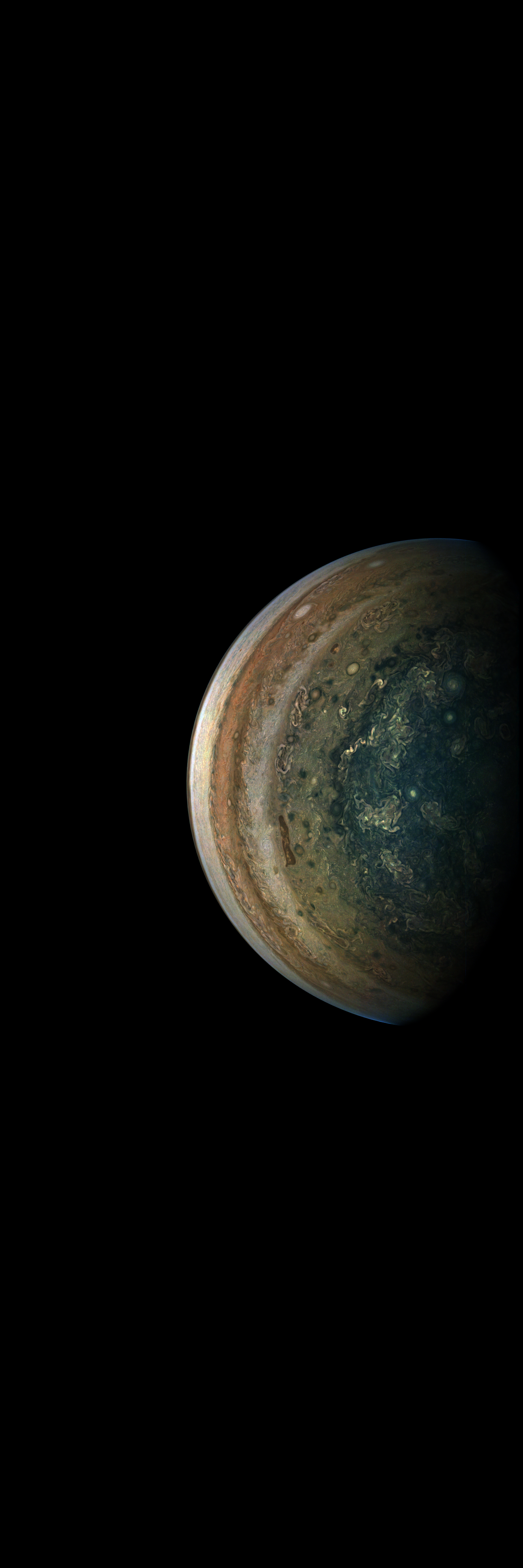 Resolution is 30 pixels per degrees in an equdistant cylindrical system centered to the camera at image stop time, with an axis parallel to Juno's spin axis. The rendered field of view is 60x180 degrees.
