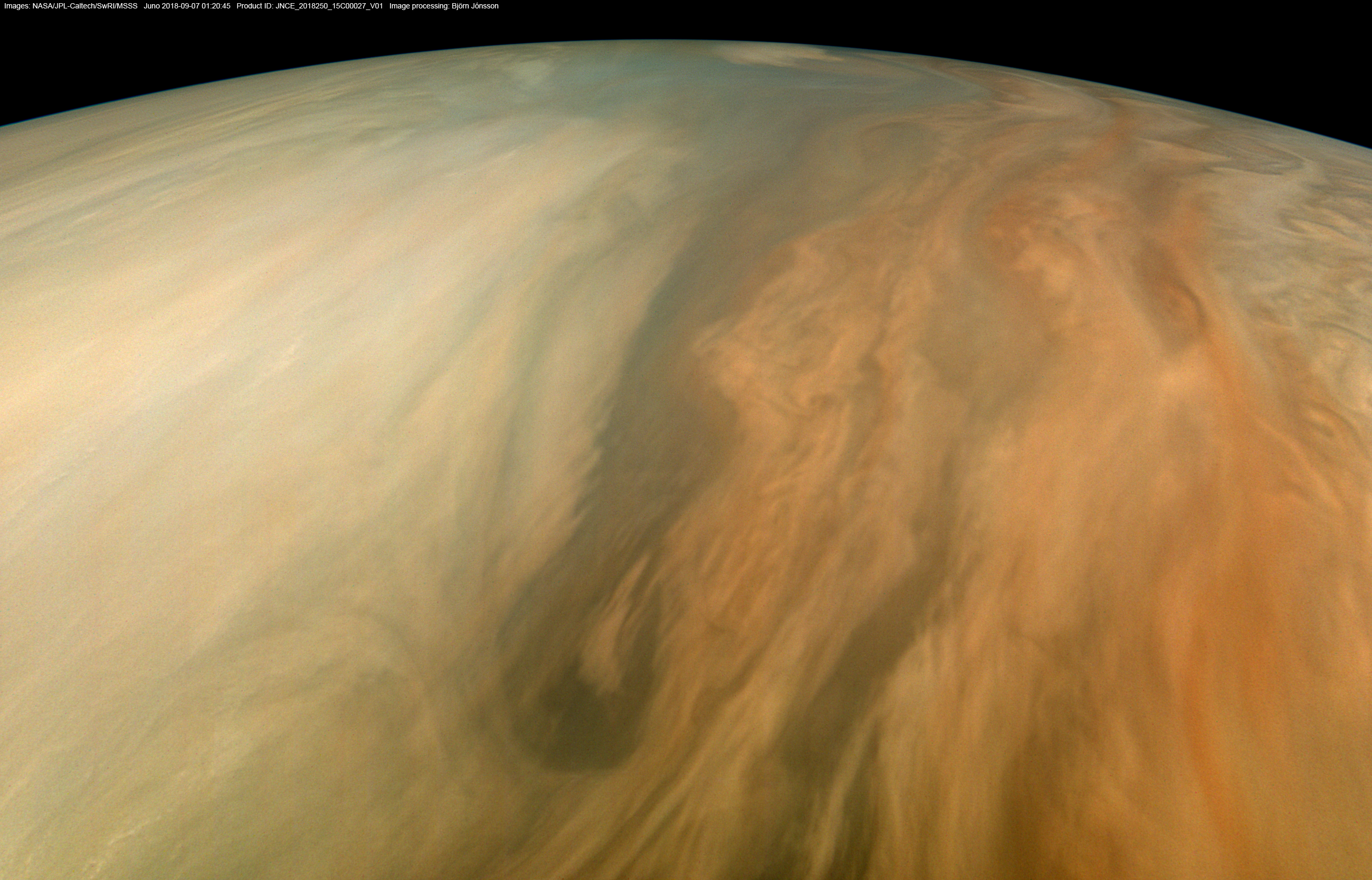 An image processed from the raw PJ15_27 image framelets. The contrast/color has been exaggerated and small scale features sharpened.