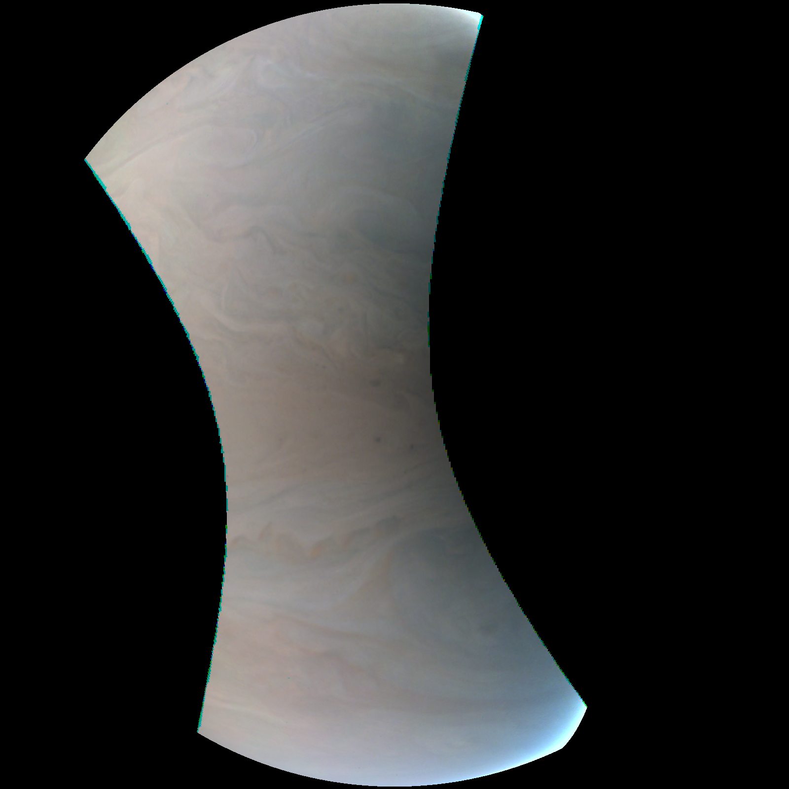 Junocam pixels are 12 bits deep from the camera but are converted to 8 bits inside the instrument using a lossless "companding" table, a process similar to gamma correction, to reduce their size. All Junocam products on the missionjuno website are in this 8-bit form as received on Earth. Scientific users interested in radiometric analysis should use the "RDR" data products archived with the Planetary Data System, which have been converted back to a linear 12-bit scale.
