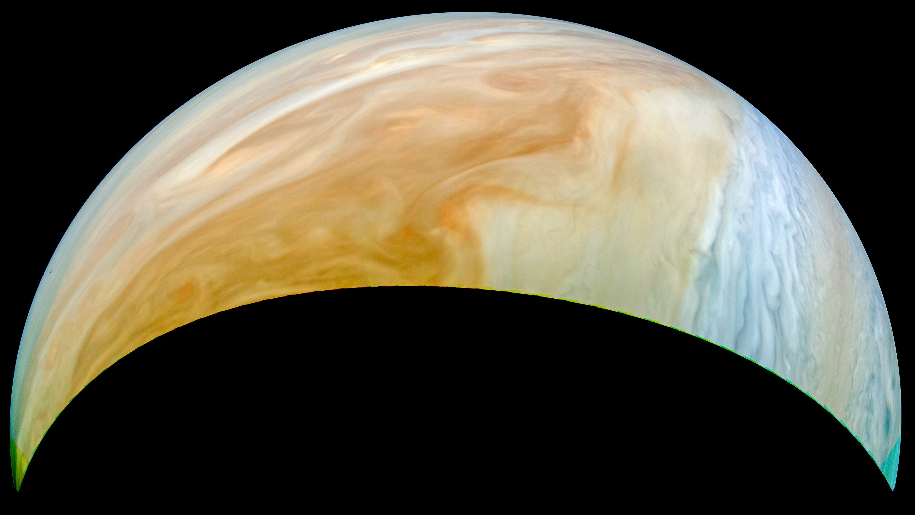 Junocam pixels are 12 bits deep from the camera but are converted to 8 bits inside the instrument using a lossless "companding" table, a process similar to gamma correction, to reduce their size. All Junocam products on the missionjuno website are in this 8-bit form as received on Earth. Scientific users interested in radiometric analysis should use the "RDR" data products archived with the Planetary Data System, which have been converted back to a linear 12-bit scale.