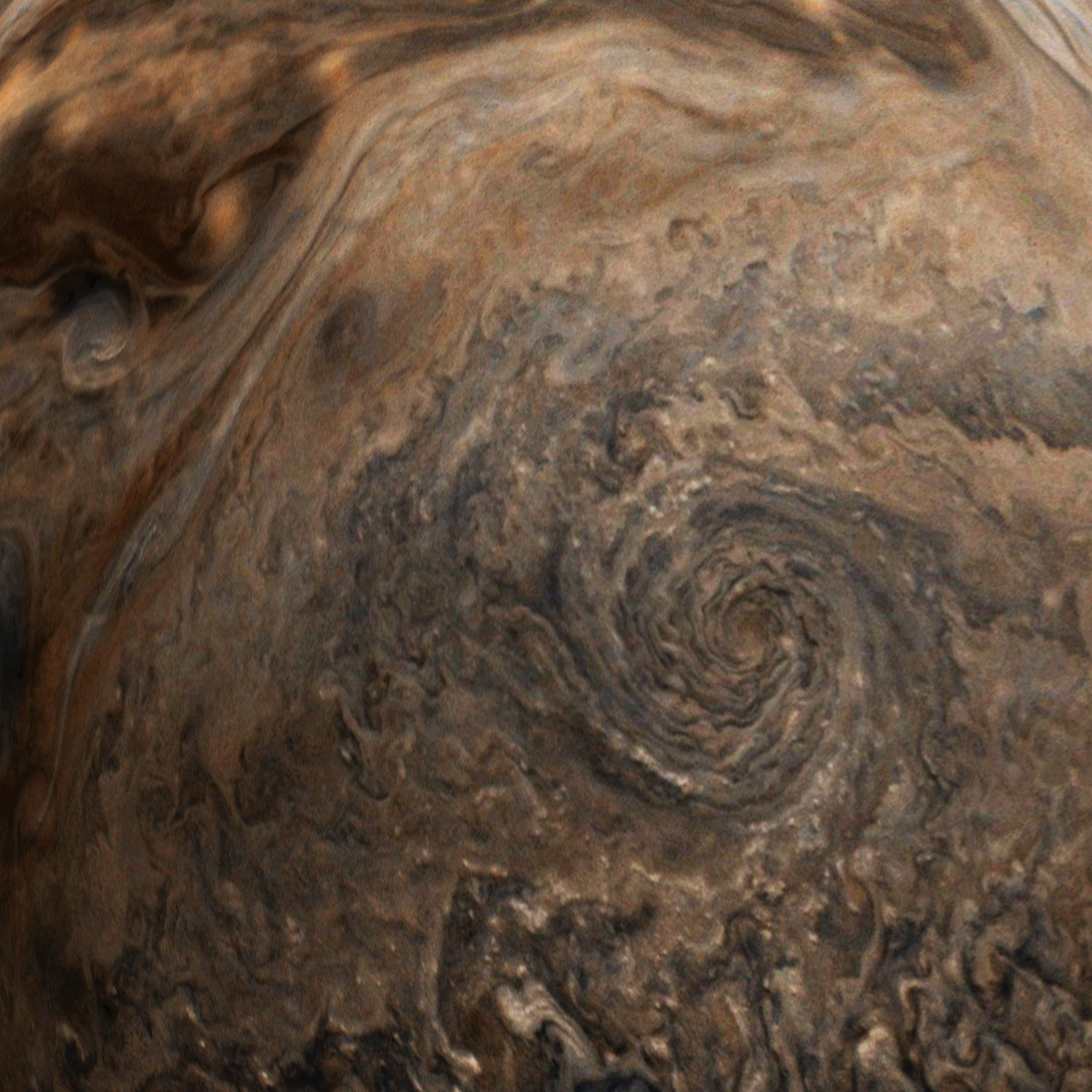 This image was taken at 9:25 a.m. PST on Feb. 12, 2019 (12:25 p.m. EST), as the spacecraft performed its 18th close flyby of Jupiter. At the time, Juno was about 5,000 miles (8,000 kilometers) from the planet's cloud tops, above a latitude of approximately 44 degrees north. This is a close-up adjusted for curvature and rendered.