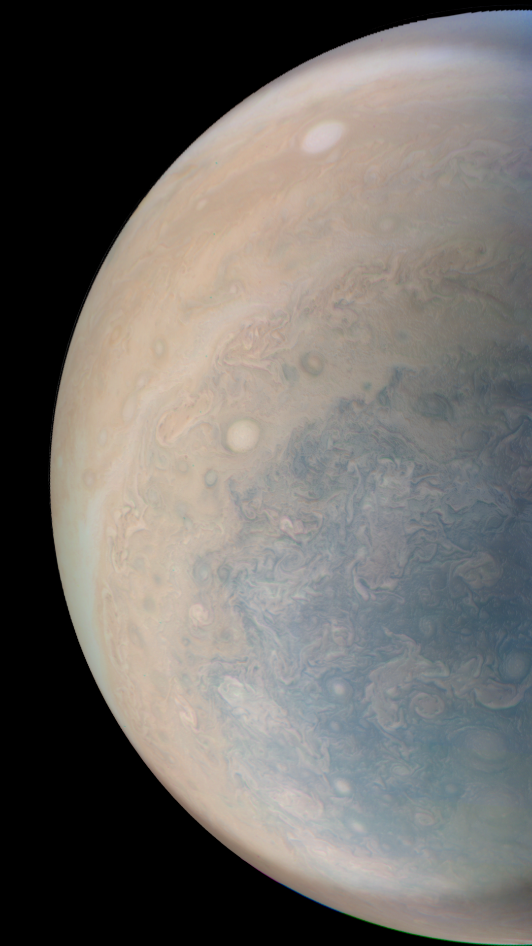 Junocam pixels are 12 bits deep from the camera but are converted to 8 bits inside the instrument using a lossless "companding" table, a process similar to gamma correction, to reduce their size. All Junocam products on the missionjuno website are in this 8-bit form as received on Earth. Scientific users interested in radiometric analysis should use the "RDR" data products archived with the Planetary Data System, which have been converted back to a linear 12-bit scale.