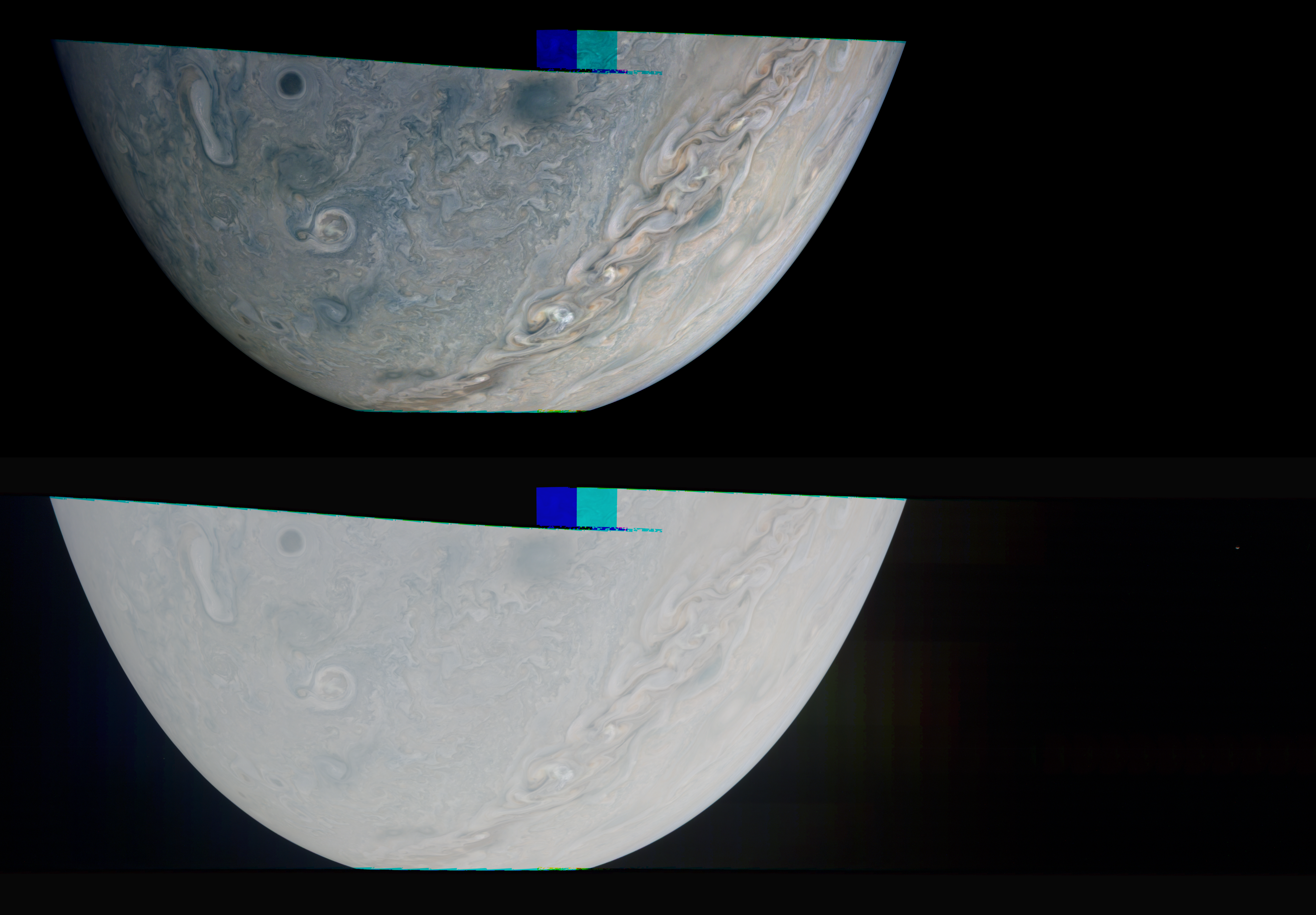 Junocam pixels are 12 bits deep from the camera but are converted to 8 bits inside the instrument using a lossless "companding" table, a process similar to gamma correction, to reduce their size. All Junocam products on the missionjuno website are in this 8-bit form as received on Earth. Scientific users interested in radiometric analysis should use the "RDR" data products archived with the Planetary Data System, which have been converted back to a linear 12-bit scale.