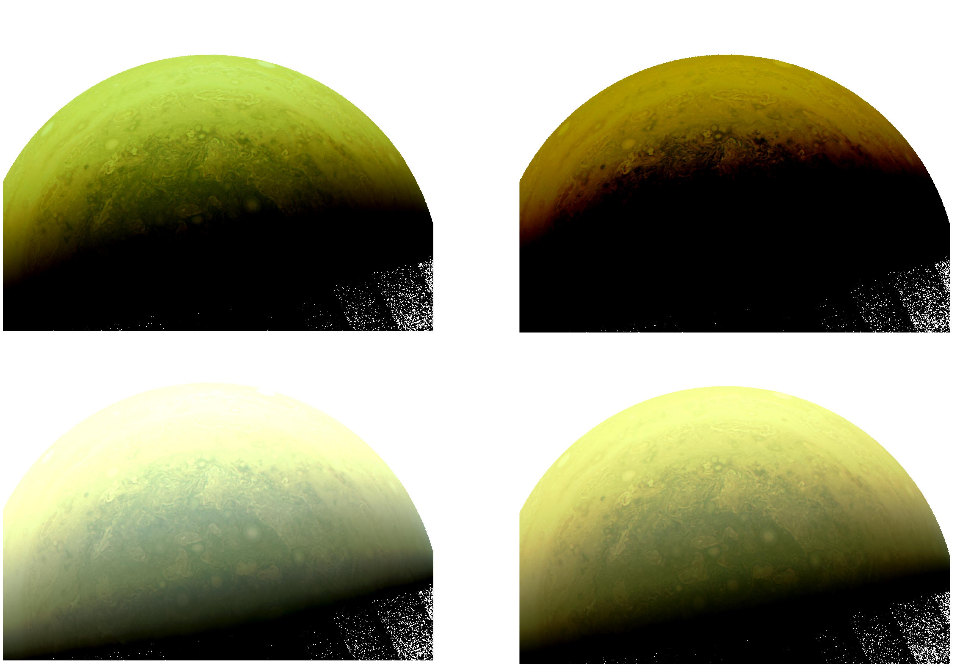 From the original image "SOUTH POLE AT MINIMUM EMISSION ANGLE" (https://www.missionjuno.swri.edu/junocam/processing?id=636) different combination of RGB bands using different thresholds of contrast that evidence the features of Jupiter at different latitudes.