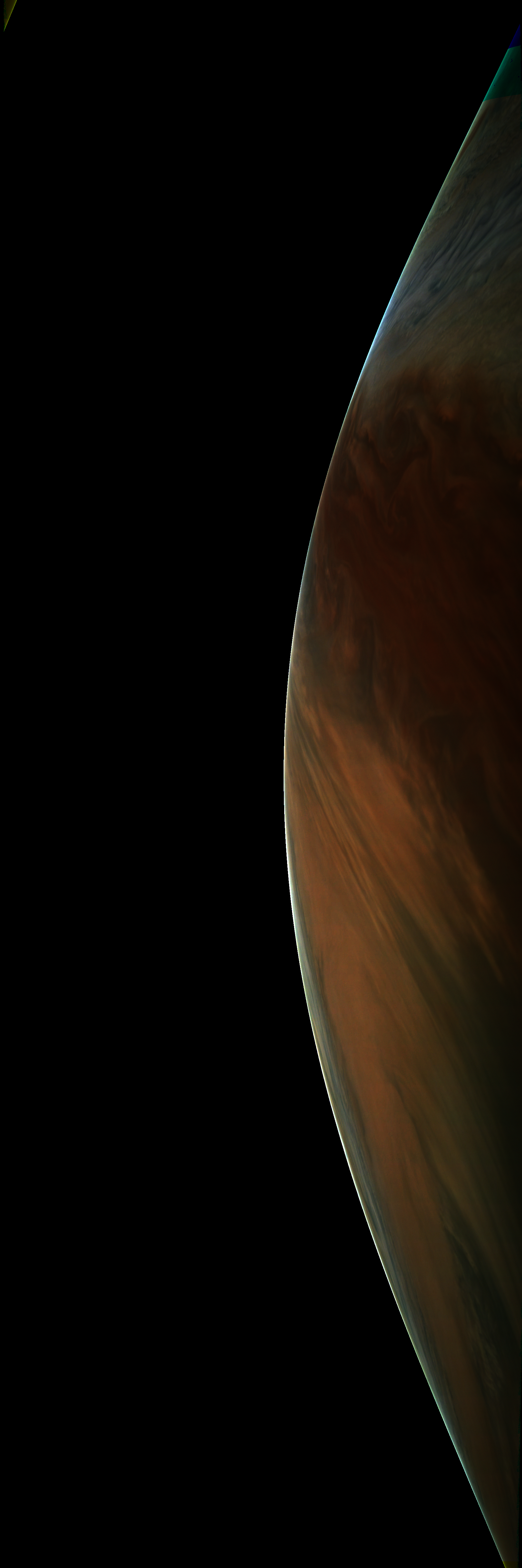 Resolution is 30 pixels per degrees in an equidistant cylindrical system centered to the camera at image stop time, with an axis parallel to Juno's spin axis. The rendered field of view is 60x180 degrees.