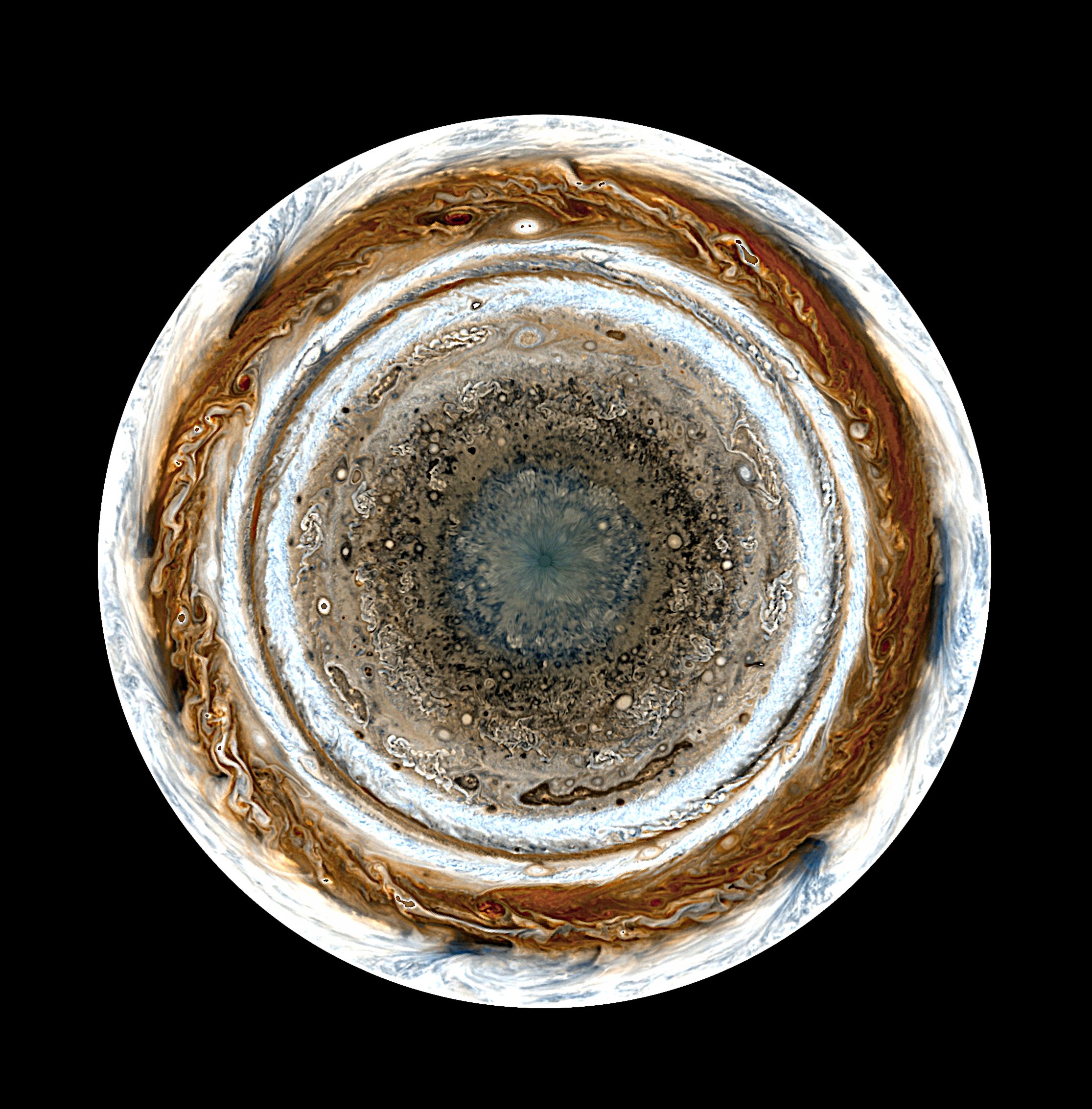 This view of the Northern Hemisphere reveals the Blue North Pole Region as a more mottled area. Altered colors, contrast, and sharpening filters were used to enhance details. ImagePIA0773.