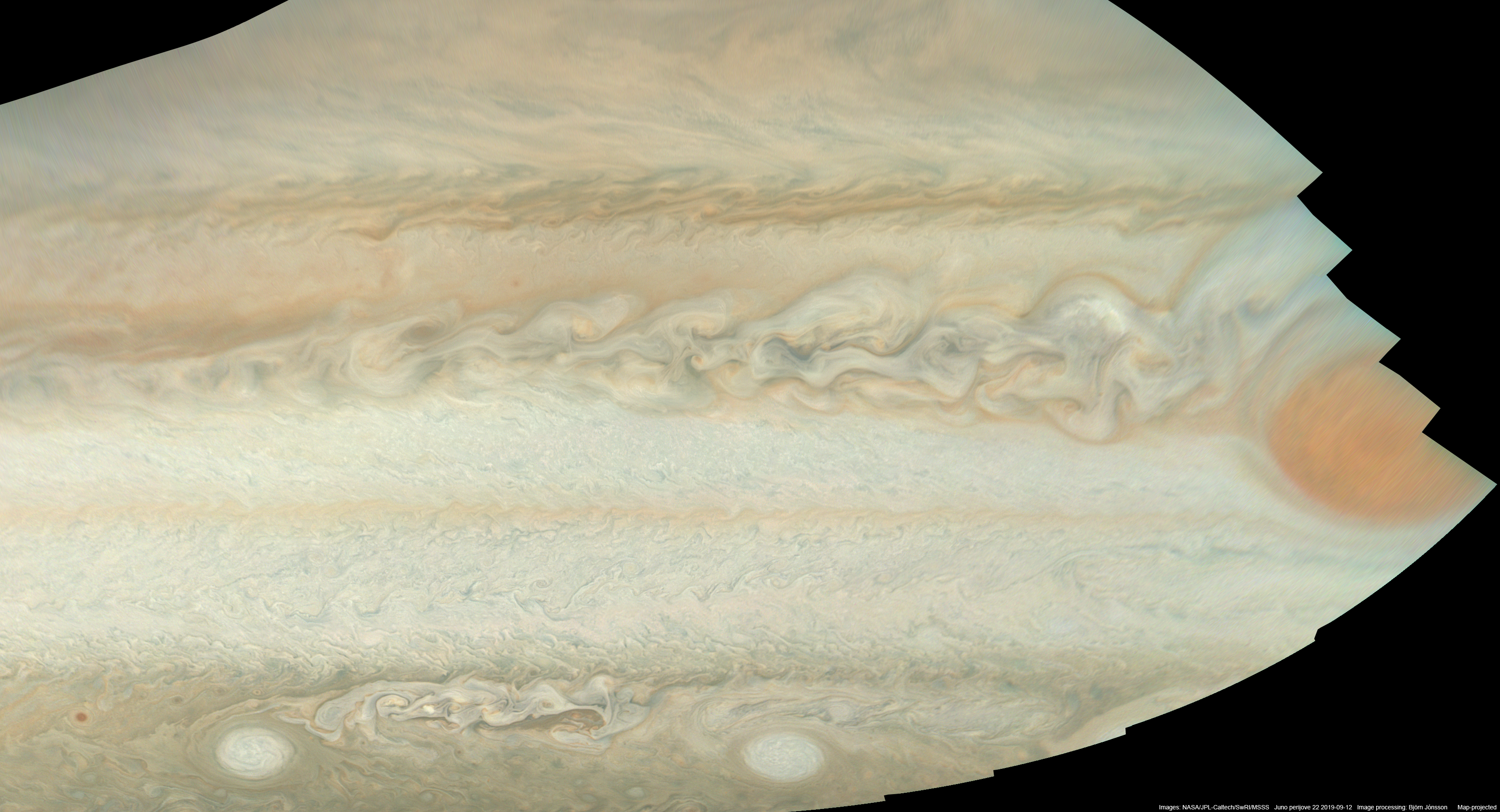 An approximately true color/contrast map-projected mosaic of PJ22 images 39 to 43 showing the convective area west of the Great Red Spot (GRS). The GRS was at the limb in the original images. Therefore it is only partially visible here and also the areas near it appear fuzzy. Despite this relatively unfavorable viewing geometry, considerable details are visible in the convective area west of the GRS. It is obvious that the convective area is still active. This is an improved version of an earlier mosaic.