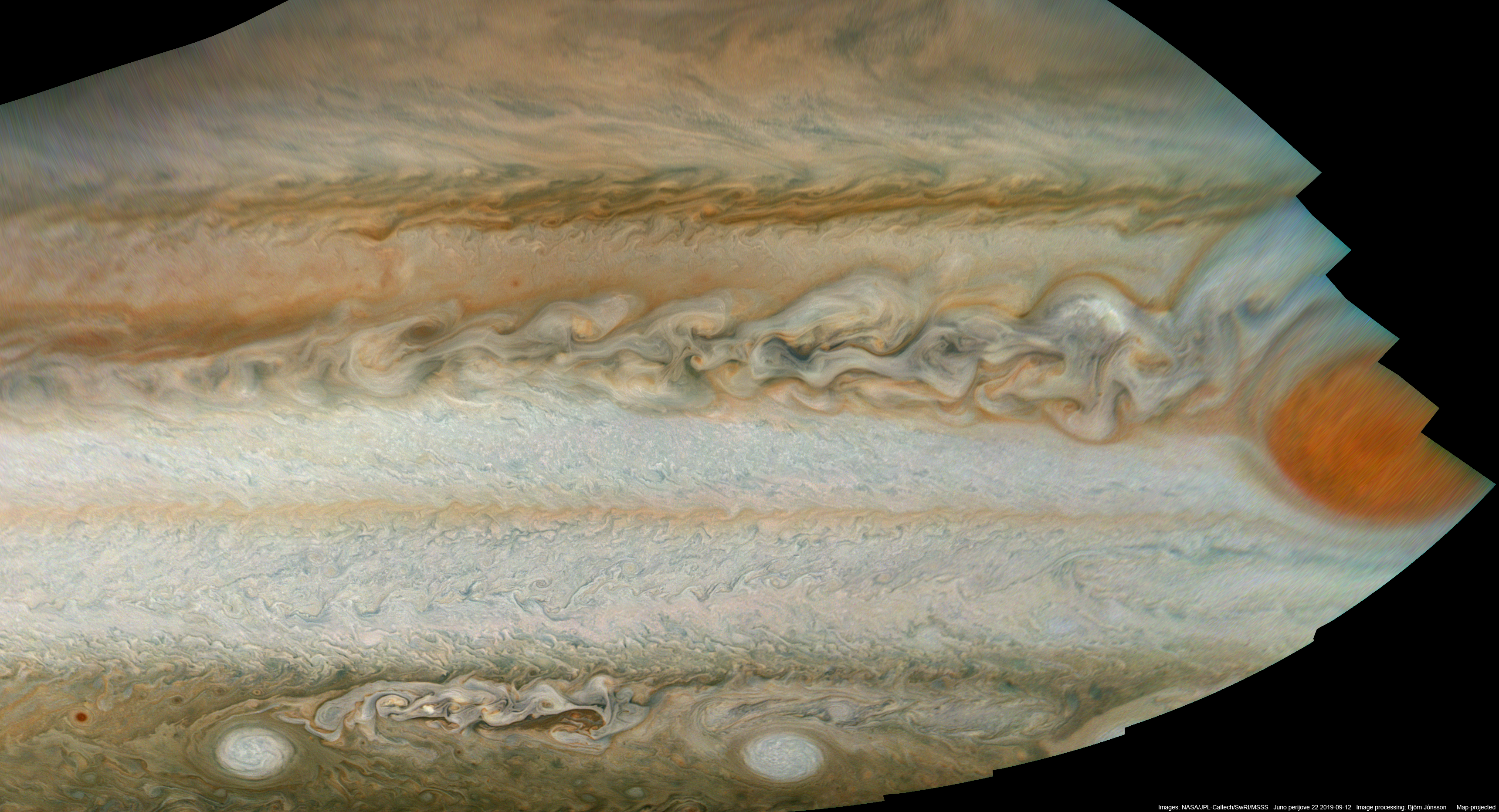 An enhanced map-projected mosaic of PJ22 images 39 to 43 showing the convective area west of the Great Red Spot (GRS). The GRS was at the limb in the original images. Therefore it is only partially visible here and also the areas near it appear fuzzy. Despite this relatively unfavorable viewing geometry, considerable details are visible in the convective area west of the GRS. It is obvious that the convective area is still active. This is an improved version of an earlier mosaic.