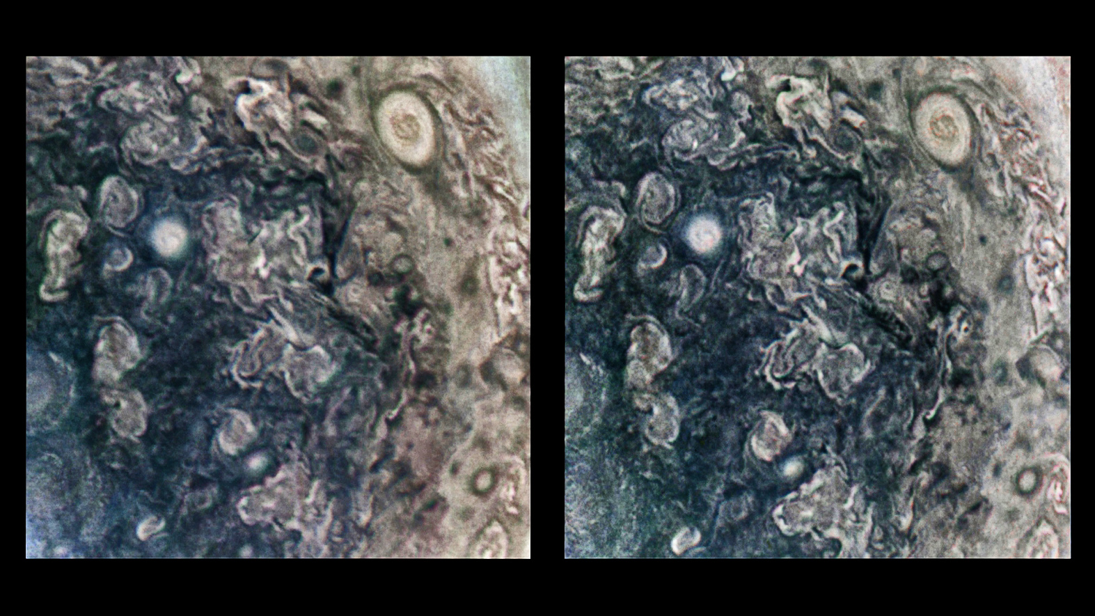 This is an actual stereograph, not an artificial 3D conversion made from a single 2D image. The 23-minute 52.9-second interval between two JunoCam images taken during the time lapse sequence of Perijove 20 (29 May 2019 at 09:28:28.990 and 09:52:21.844 UTC) established a stereo base (camera separation) of thousands of kilometers, from which this stereographic image pair was crafted using Photoshop. Thanks to the velocity of Juno, the distance traveled during the interval between these two captures effectively gives our eyes that same separation. Viewing Jupiter at a known average altitude of 139,608.85 km (86,748.8 miles),