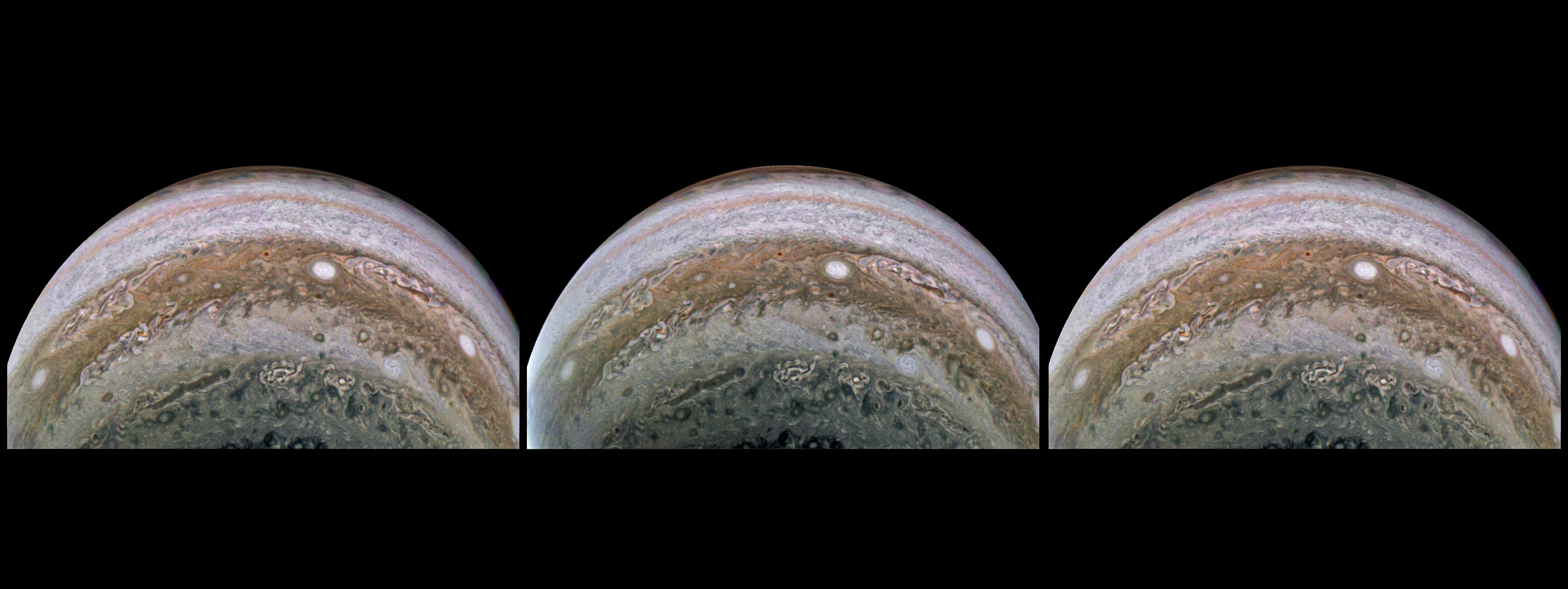 This is an actual stereograph, not an artificial 3D conversion made from a single 2D image. The 6-minute 1.0-second interval between two JunoCam images taken during the time lapse sequence of Perijove 22 (12 September 2019 at 04:37:55.259 and 04:43:56.239 UTC) established a stereo base (camera separation) of thousands of kilometers, from which this stereographic image pair was crafted using Photoshop. Thanks to the velocity of Juno, the distance traveled during the interval between these two captures effectively gives our eyes that same separation. Viewing Jupiter at a known average altitude of 85,954.05 km (53,409.3 miles), it's nevertheless possible to perceive features of the atmosphere three dimensionally. Juno's actual speed and, thus, the stereo base for this image pair from Perijove 22, is unknown (at least to the creator of this stereograph). Note that during the 6-minute 1.0-second interval, Juno ascended 10,283.3 km (6,389.7 miles), from 80,812.4 km to 91,095.7 km (a 12.72% gain in altitude), requiring z-axis correction in addition to x- and y-axis skewing, to produce the stereograph.