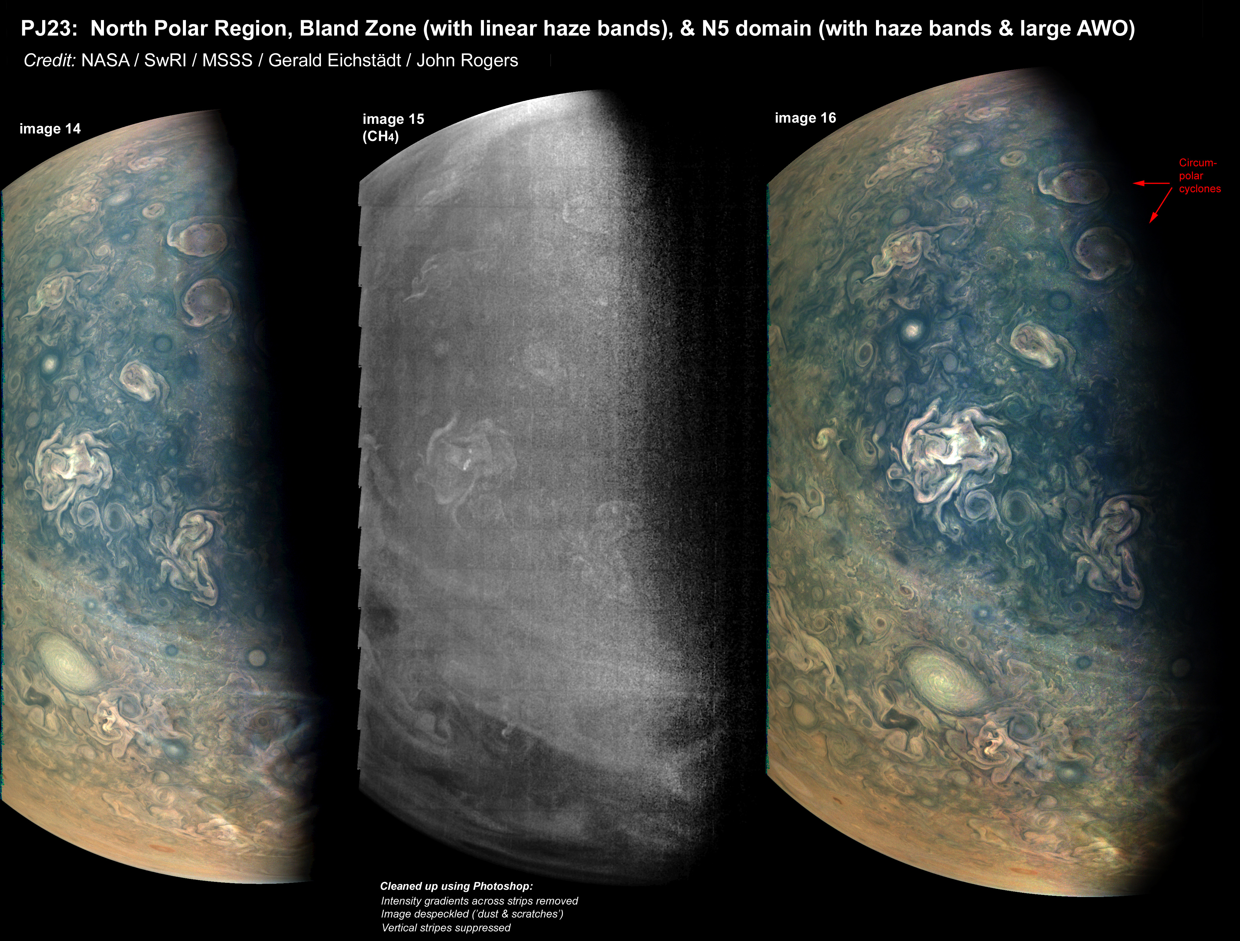 These are further-processed versions of images provided by Gerald Eichstädt: the colour images were intesnity-adjusted, and the methane image (showing high-level hazes) was cleaned up as described below the image. This is one of JunoCam's most informative methane images of these latitudes. The images cover the North Polar Region, the Bland Zone (with a fine display of the linear haze bands that are typical of this zone), and the N5 domain (with more irregular haze bands). The large anticyclonic white oval in the N5 domain is one has tracked throughout 2019 in ground-based images, as analysed by the JUPOS team.
