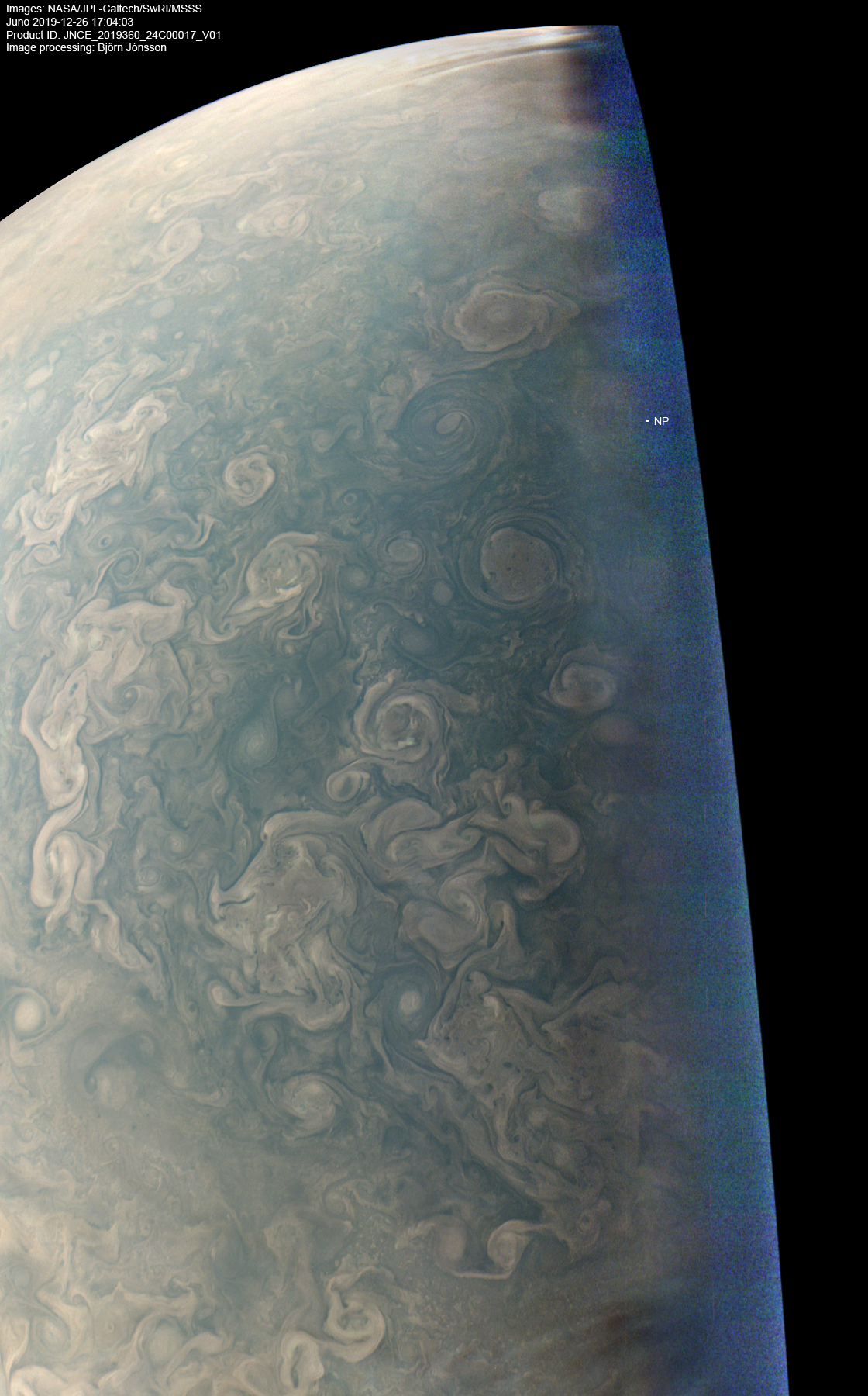 An image processed from the PJ24_17 raw image framelets. The image has been processed to reveal details in the faintly illuminated area near the terminator. The contrast and colors have also been exaggerated. The position of the north pole is shown.