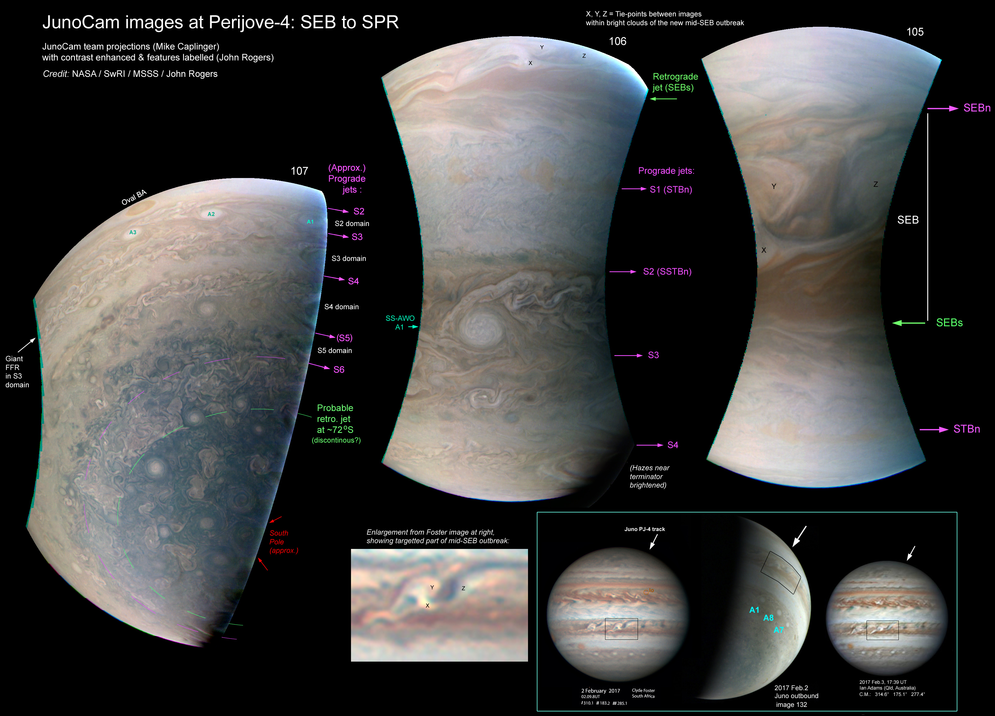 This shows the 3 images covering the southern hemisphere, plus context images. The positions of the known circulations and jets are indicated. Part of the new mid-SEB outbreak was beautifully captured in image 105 and (near the horizon) in image 106. Not surprisingly, it looks somewhat similar to the regions of white rifts in the NEB (Figure 5) and in the SEB west of the GRS (at PJ-3). The STB is completely absent in this sector, and there is no sign of recirculation, but pale orange patches in the STBn latitude (with no evident vorticity) represent very subdued disturbance on the STBn jet. As expected, image 106 did not cover oval BA, but it did capture a fine view of one of the S.S. Temperate anticyclonic white ovals (SS-AWOs or ‘string of pearls’); this is number A1, with turbulent tendrils being twisted around it.