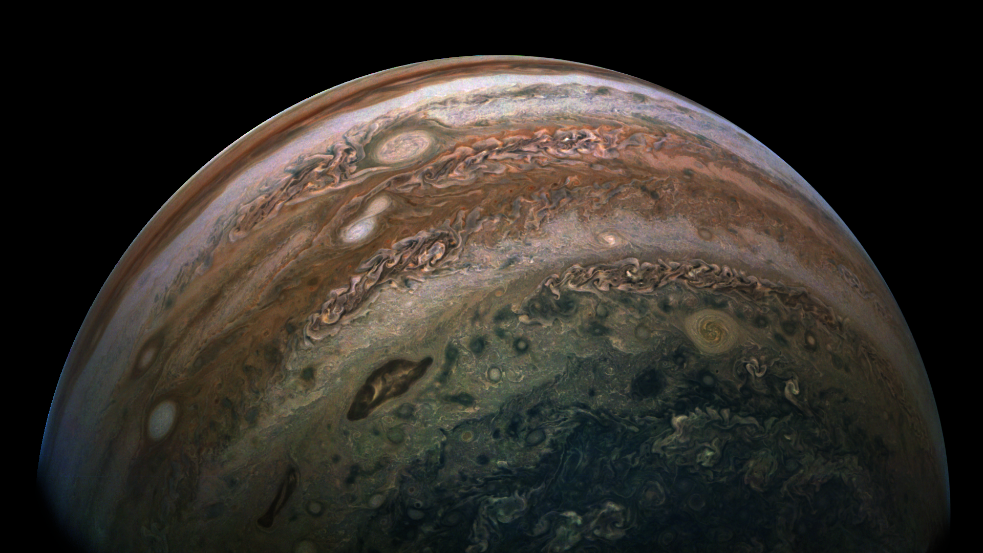 This post-processed image shows several of the most interesting features of the PJ24 flyby, especially several more or less long-lived anticyclones, two of them in contact, presumably merging.
