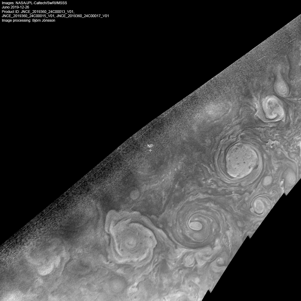 A north polar projection map showing the area around Jupiter's north pole. The map was created by stacking the red framelets from images PJ24_13, PJ24_15 and PJ24_17. The stacking results in significantly reduced noise in the resulting image. The contrast was then increased and small scale details sharpened. Only the red framelets were used since they show more details near the terminator than the green and blue framelets (the blue framelets show no details at all at the terminator). Images PJ24_19 and PJ24_21 also show this area but they were obtained with a shorter exposure time and therefore do not show useful details at the terminator. The position of the north pole is indicated with a cross.
