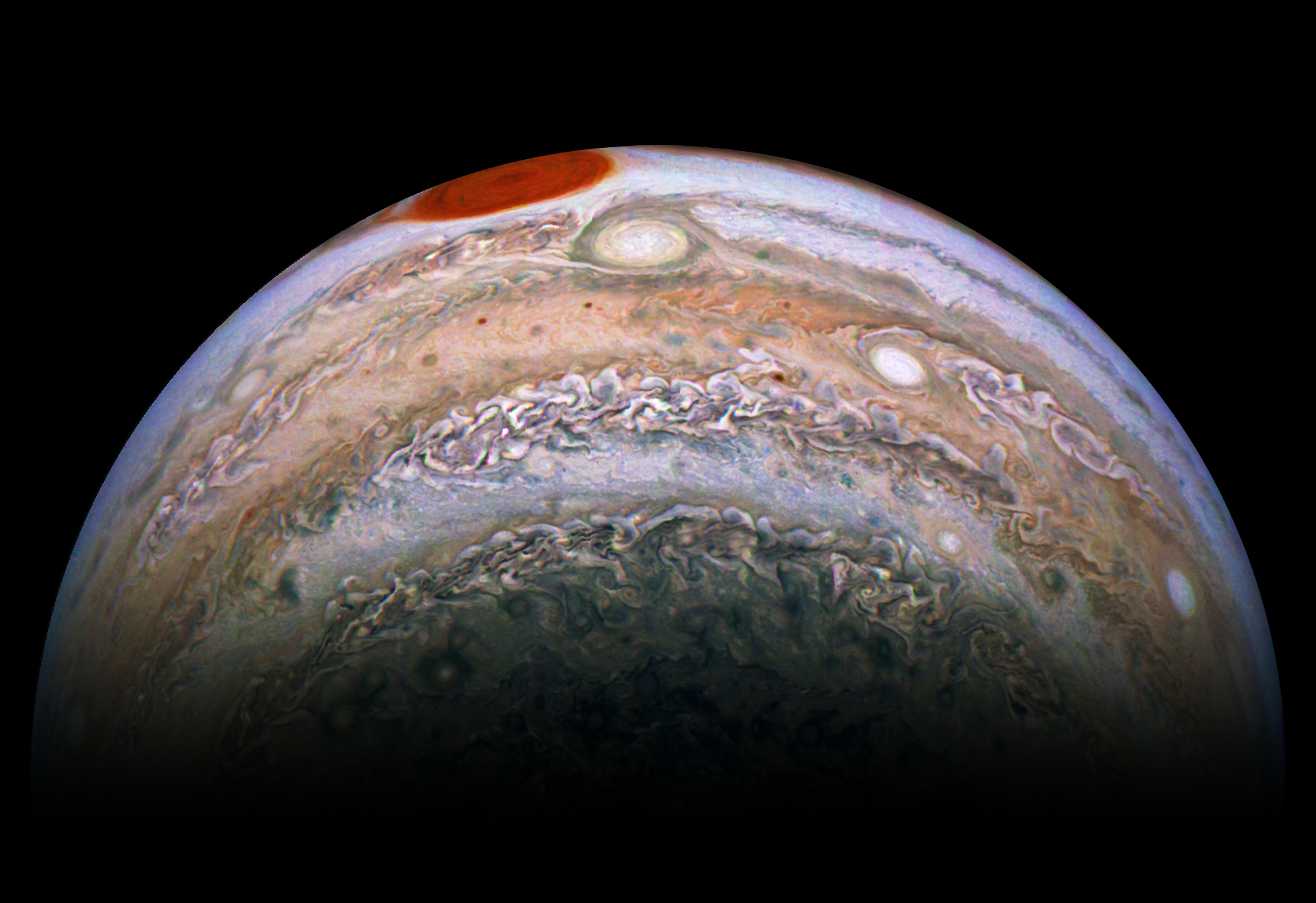 The image captured during PERIJOVE 17 - PJ17 SOUTHERN TIMELAPSE SEQUENCE seemed interesting, with the Great Red Spot at the edge. Few Photoshop layers later, this is what I got.