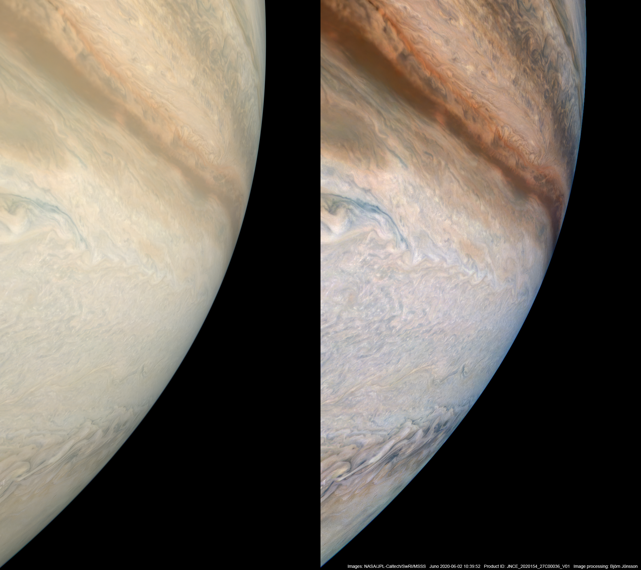 An approximately true color/contrast image (left) and an enhanced image (right) processed from the PJ27_36 raw image framelets. North is up.