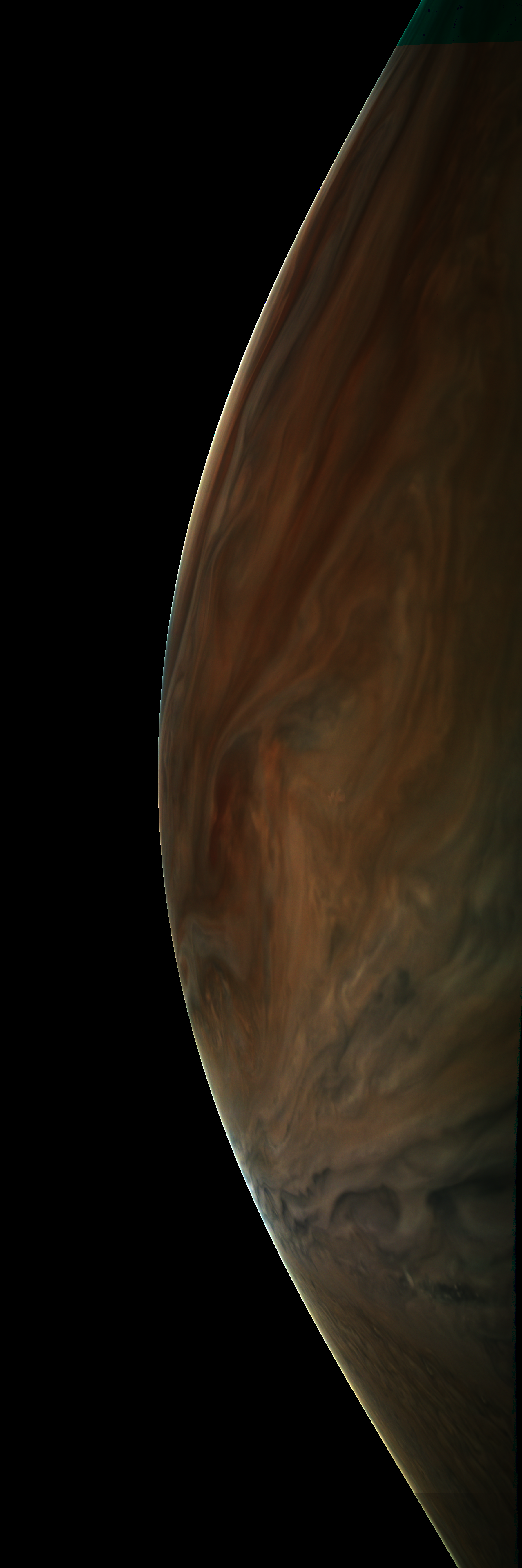 Resolution is 30 pixels per degrees in an equidistant cylindrical system centered to the camera at image stop time, with an axis parallel to Juno's spin axis. The rendered field of view is 60x180 degrees.