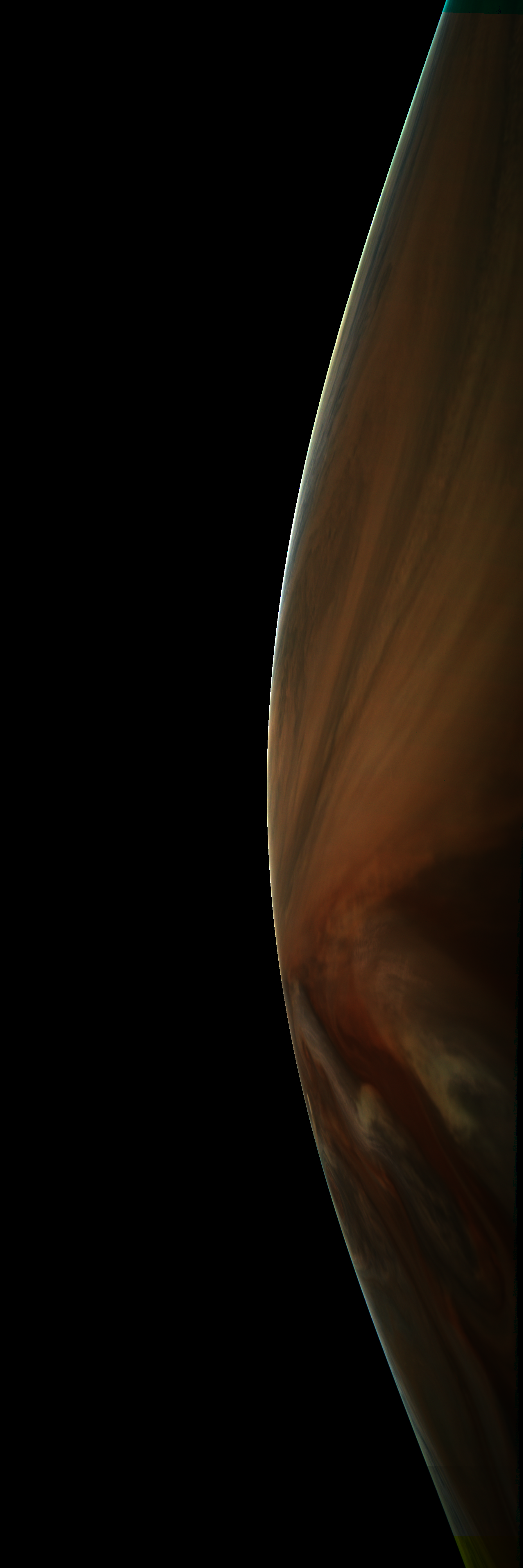 Resolution is 30 pixels per degrees in an equidistant cylindrical system centered to the camera at image stop time, with an axis parallel to Juno's spin axis. The rendered field of view is 60x180 degrees.