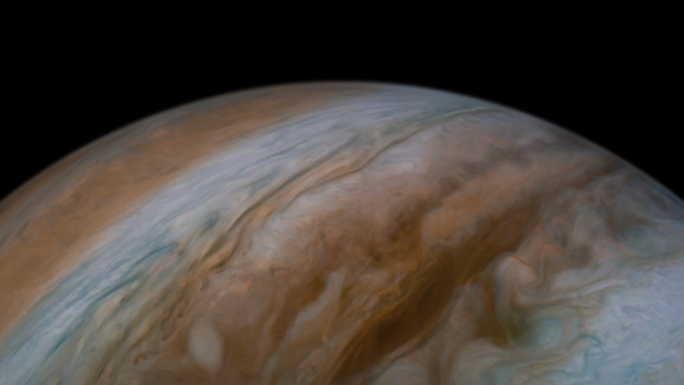Processed using the JunoCam imager's PJ30 South Tropical Band North raw images and data from NASA's Juno spacecraft flyby on November 8, 2020. Enhanced to highlight features, clouds, colours, and the beauty of Jupiter. Artist's impression - not representative of true colour.