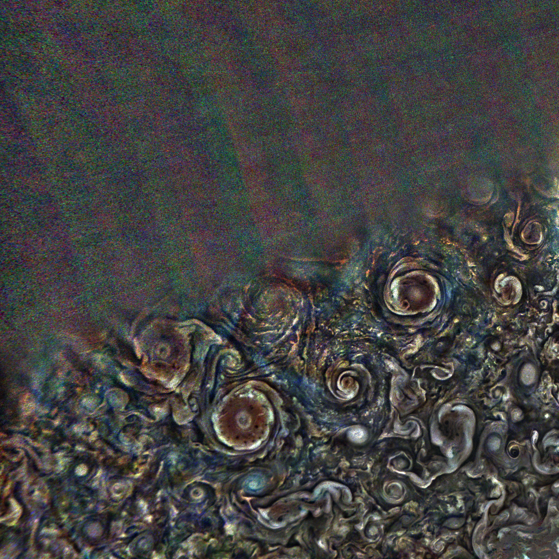 North polar equidistant planetocentric azimuthal map stacked from high-passed and contrast-normalized maps of four PJ31 JunoCam images.