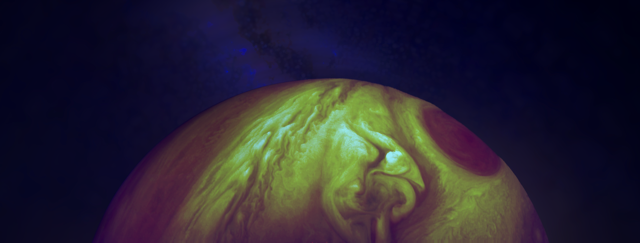 Using Juno's "PJ31 Great Red Spot Wake" rgb images, GIMP, and a picture of the milky way. Edited colors to create a videogame-like color scheme and added cloud depth by moving lighter tones up by a few pixels.