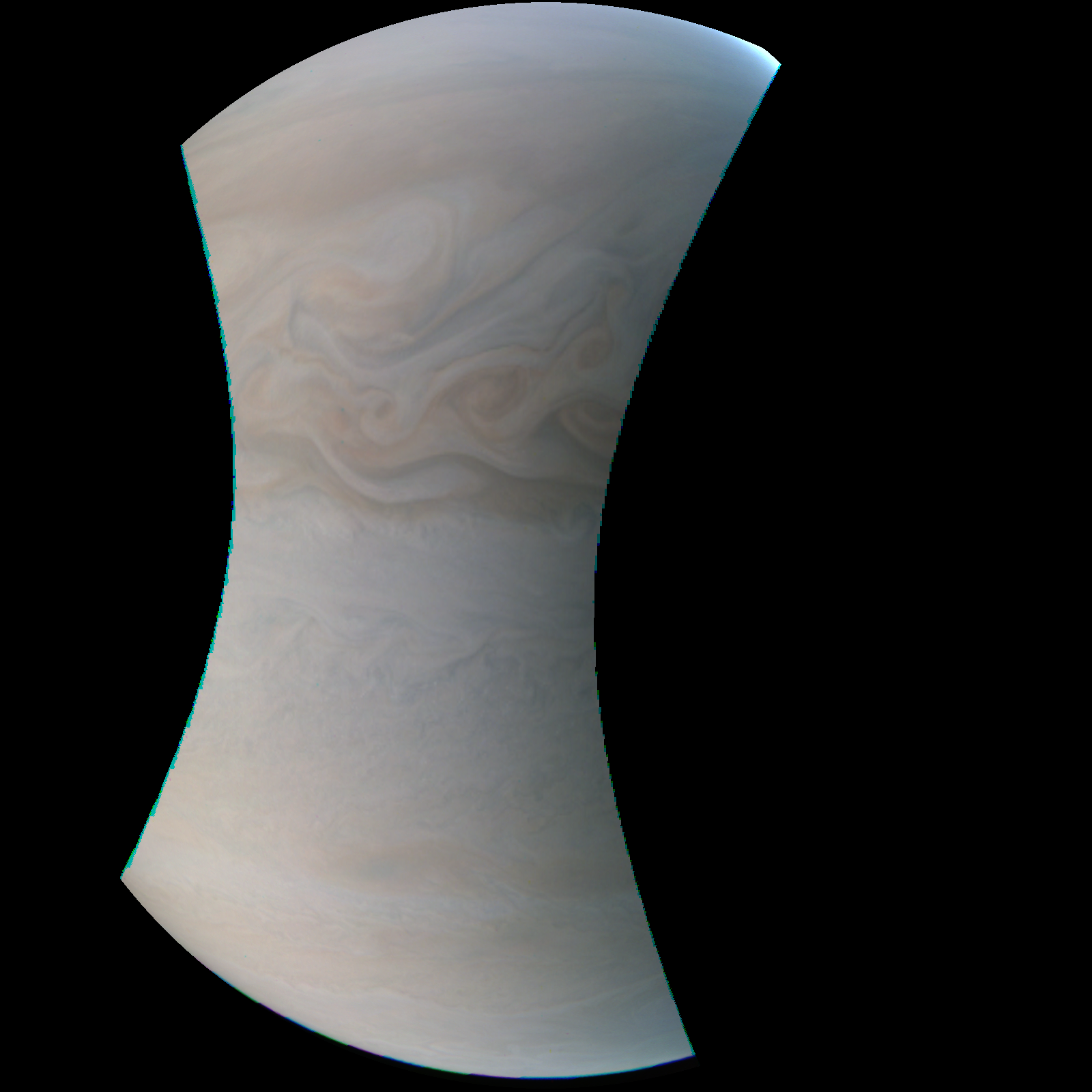 Junocam pixels are 12 bits deep from the camera but are converted to 8 bits inside the instrument using a lossless "companding" table, a process similar to gamma correction, to reduce their size. All Junocam products on the missionjuno website are in this 8-bit form as received on Earth. Scientific users interested in radiometric analysis should use the "RDR" data products archived with the Planetary Data System, which have been converted back to a linear 12-bit scale.