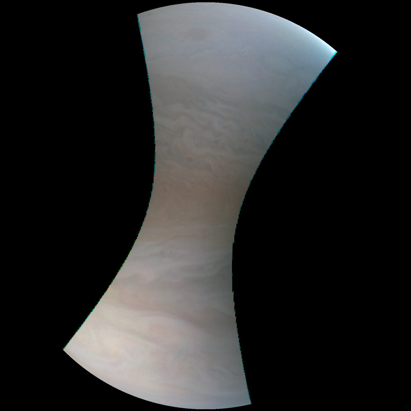 Junocam pixels are 12 bits deep from the camera but are converted to 8 bits inside the instrument using a lossless "companding" table, a process similar to gamma correction, to reduce their size. All Junocam products on the missionjuno website are in this 8-bit form as received on Earth. Scientific users interested in radiometric analysis should use the "RDR" data products archived with the Planetary Data System, which have been converted back to a linear 12-bit scale.