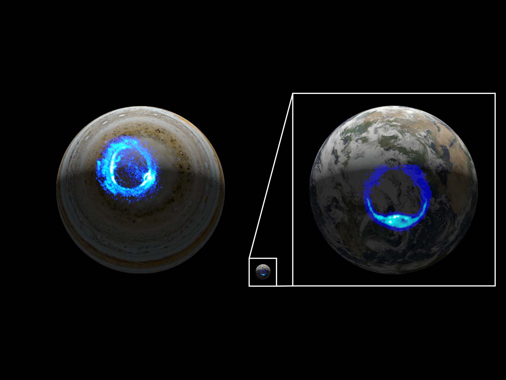This illustration depicts ultraviolet polar aurorae on Jupiter and Earth. While the diameter of the Jovian world is 10 times larger than that of Earth, both planets have markedly similar aurora. Image Credit: NASA/JPL-Caltech/SwRI/UVS/STScI/MODIS/WIC/IMAGE/ULiège