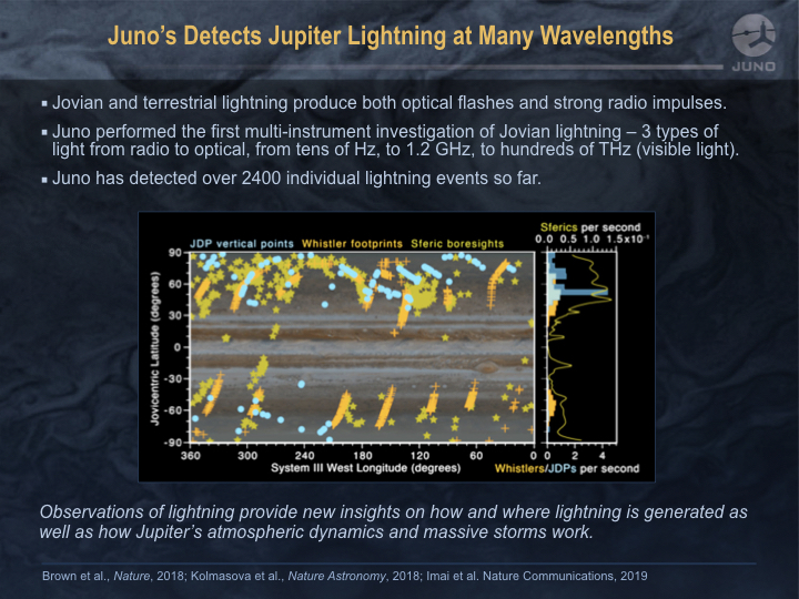 Juno performed the first multi-instrument investigation of Jovian lightning - 3 types of light from radio to optical, from radio to optical, from tens of Hz, to 1.2 GHz, to hundreds of THz (visible light).